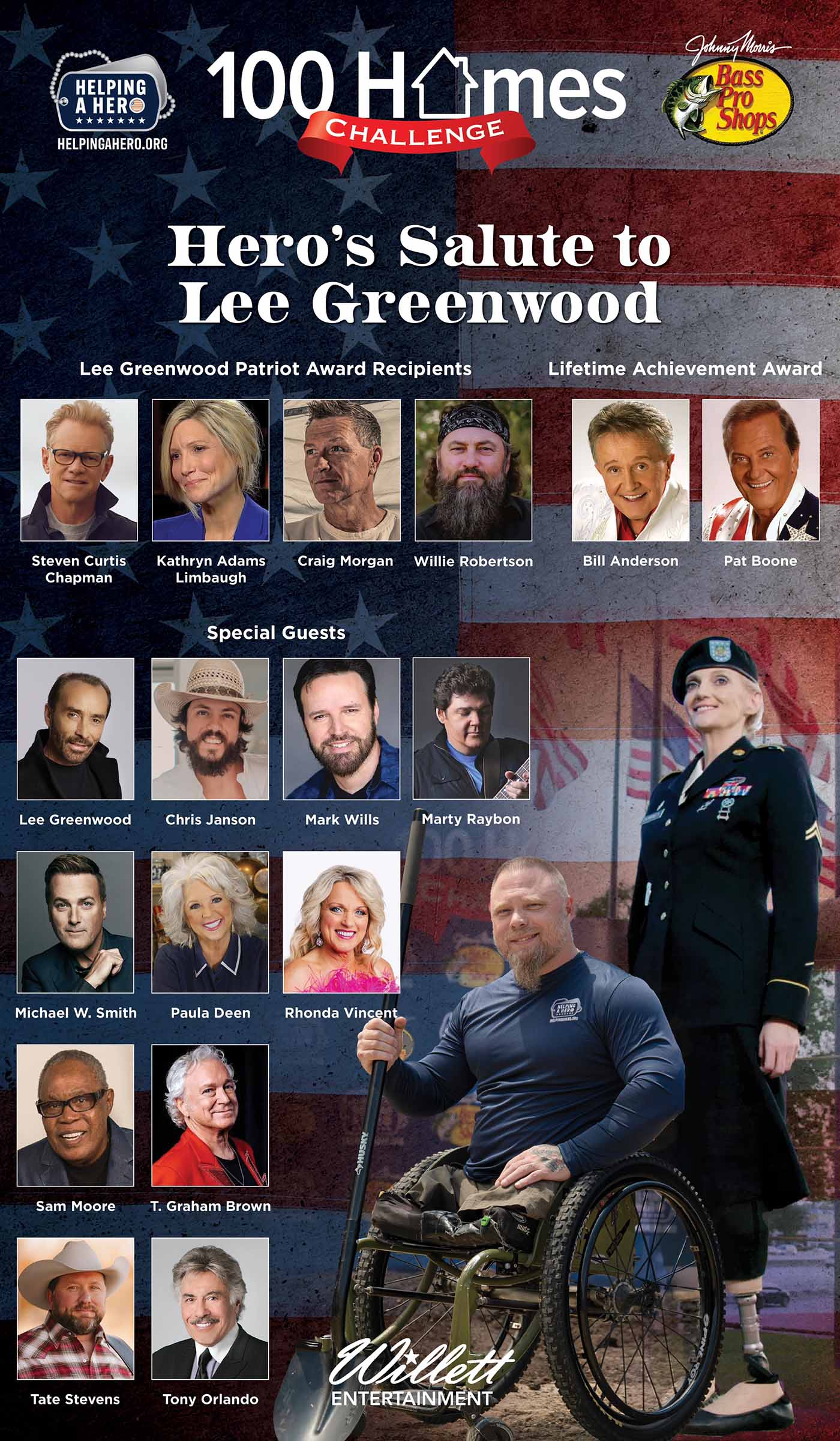 The Lee Greenwood Patriot Award Experience and Concert will be a night of patriotism featuring stories from our wounded warriors, including triple amputee Sgt Carlos Evans, USMC (Ret). Johnny Morris, Founder and CEO of Bass Pro Shops launched the Helping a Hero 100 Homes Challenge and is funding 25% of the cost of our next 100 adapted homes.